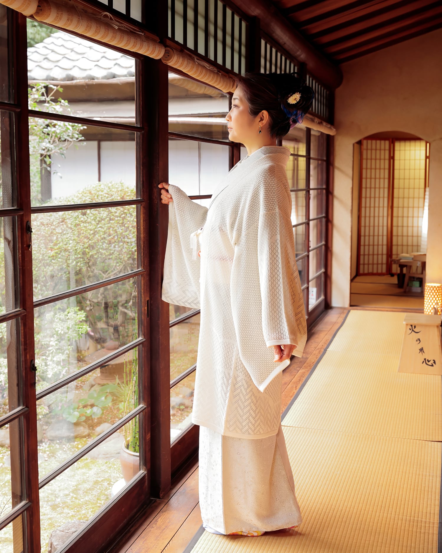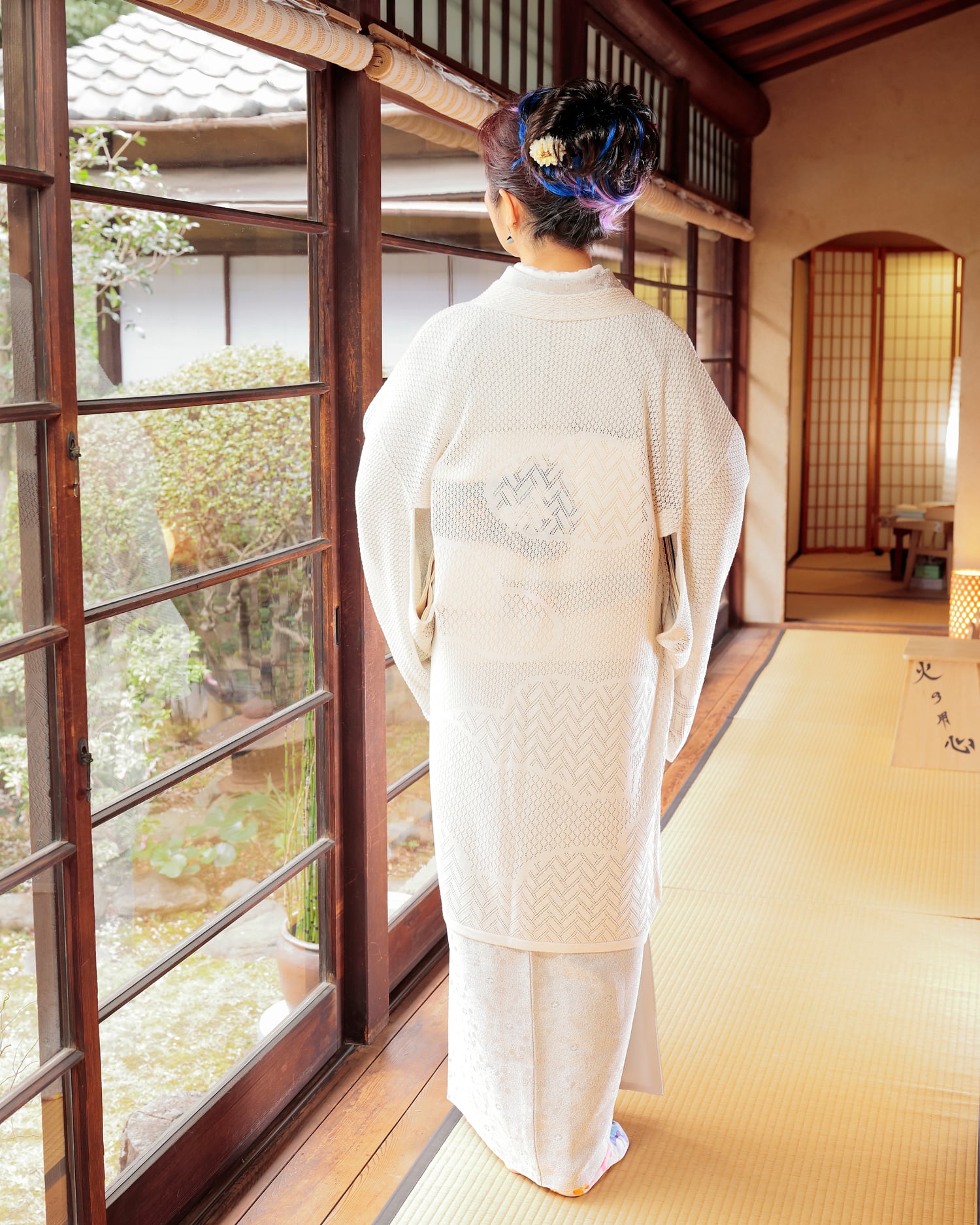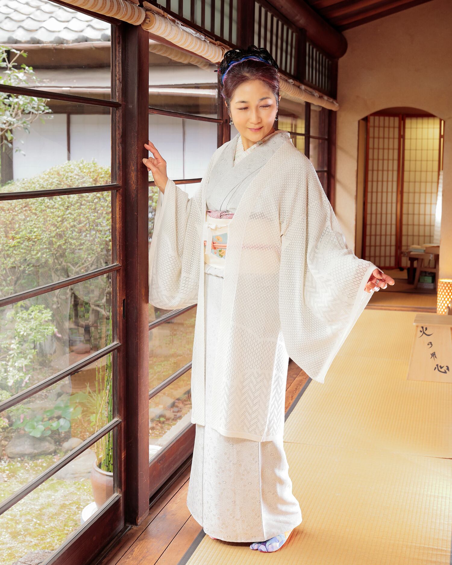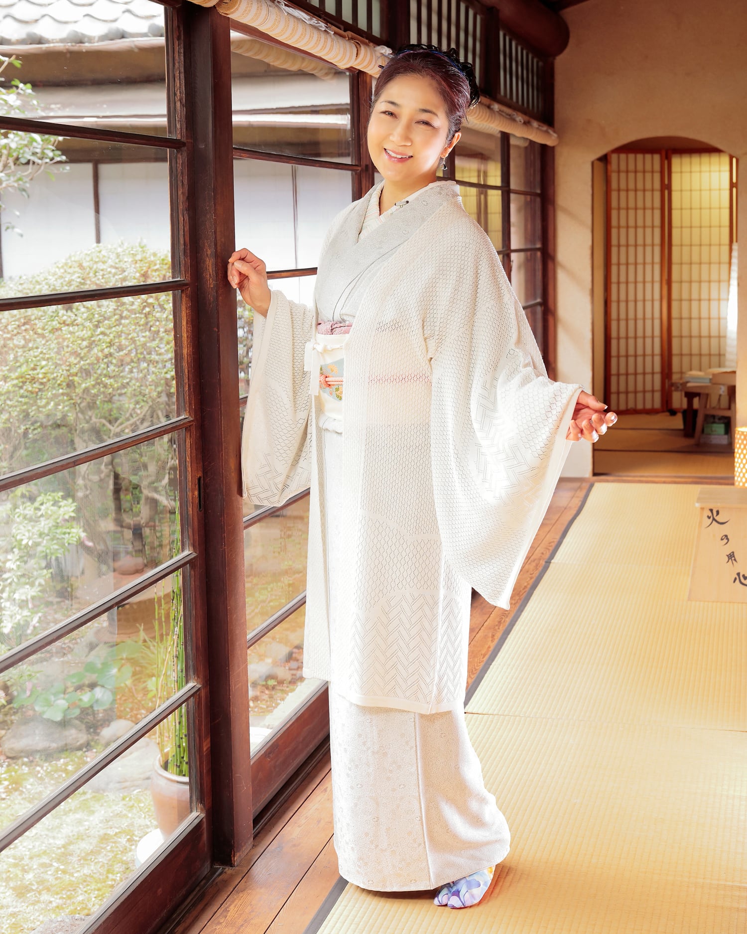 やわらかな杢調の白は、顔まわりを明るく見せ、どんな着物にも自然になじむ万能カラー。