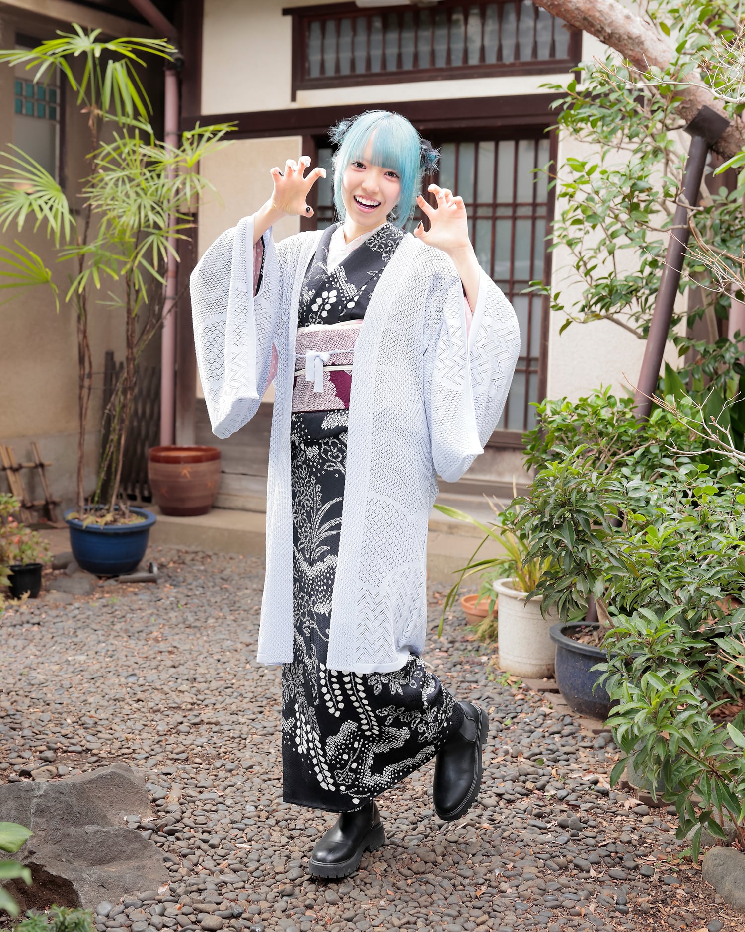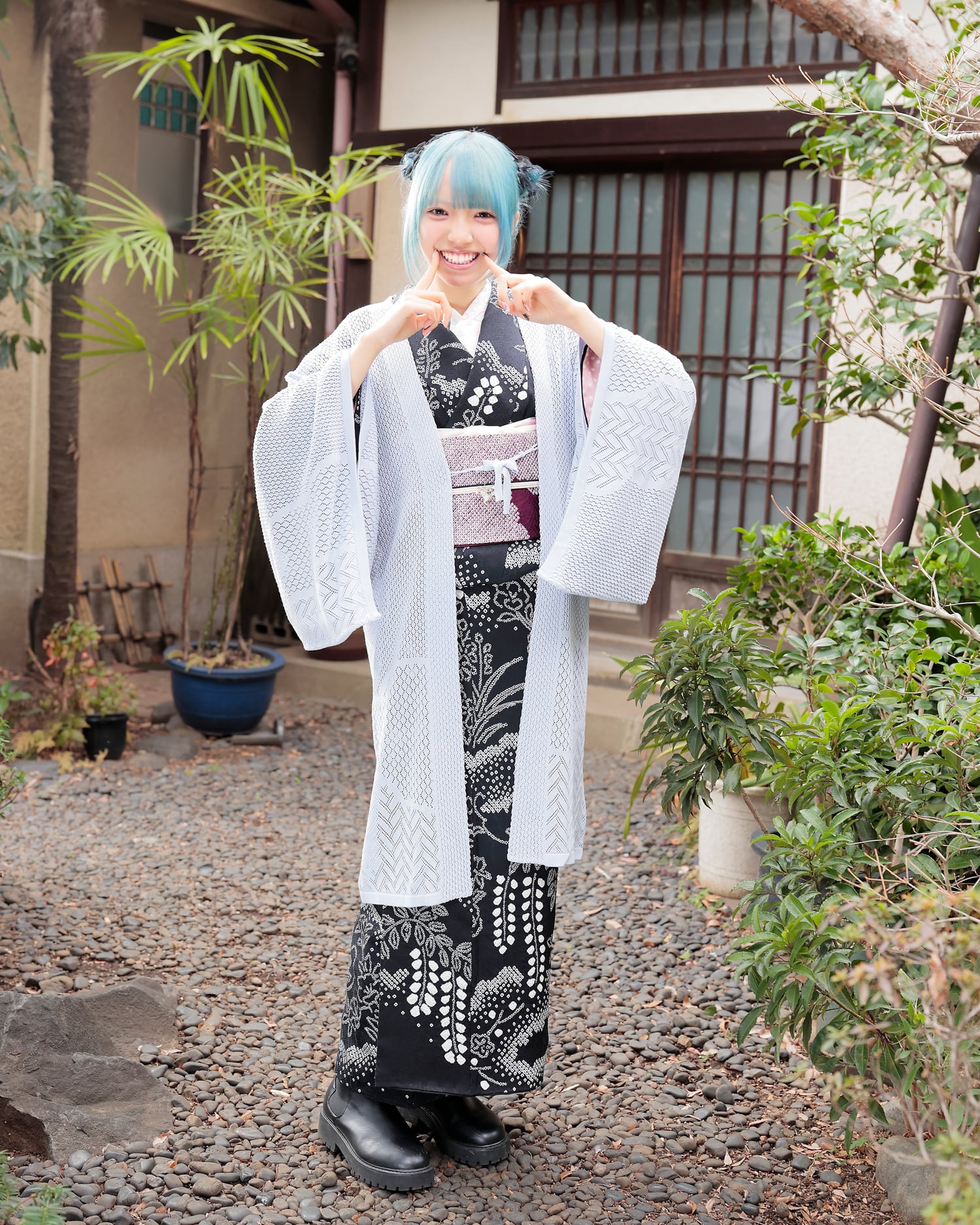 ※モデル:白い着物165㎝、黒い着物161㎝、パンツスタイル161㎝