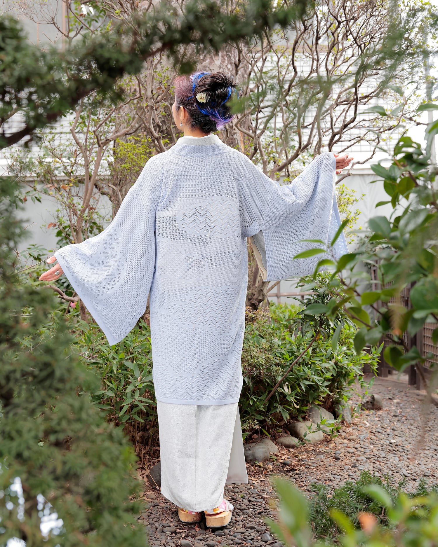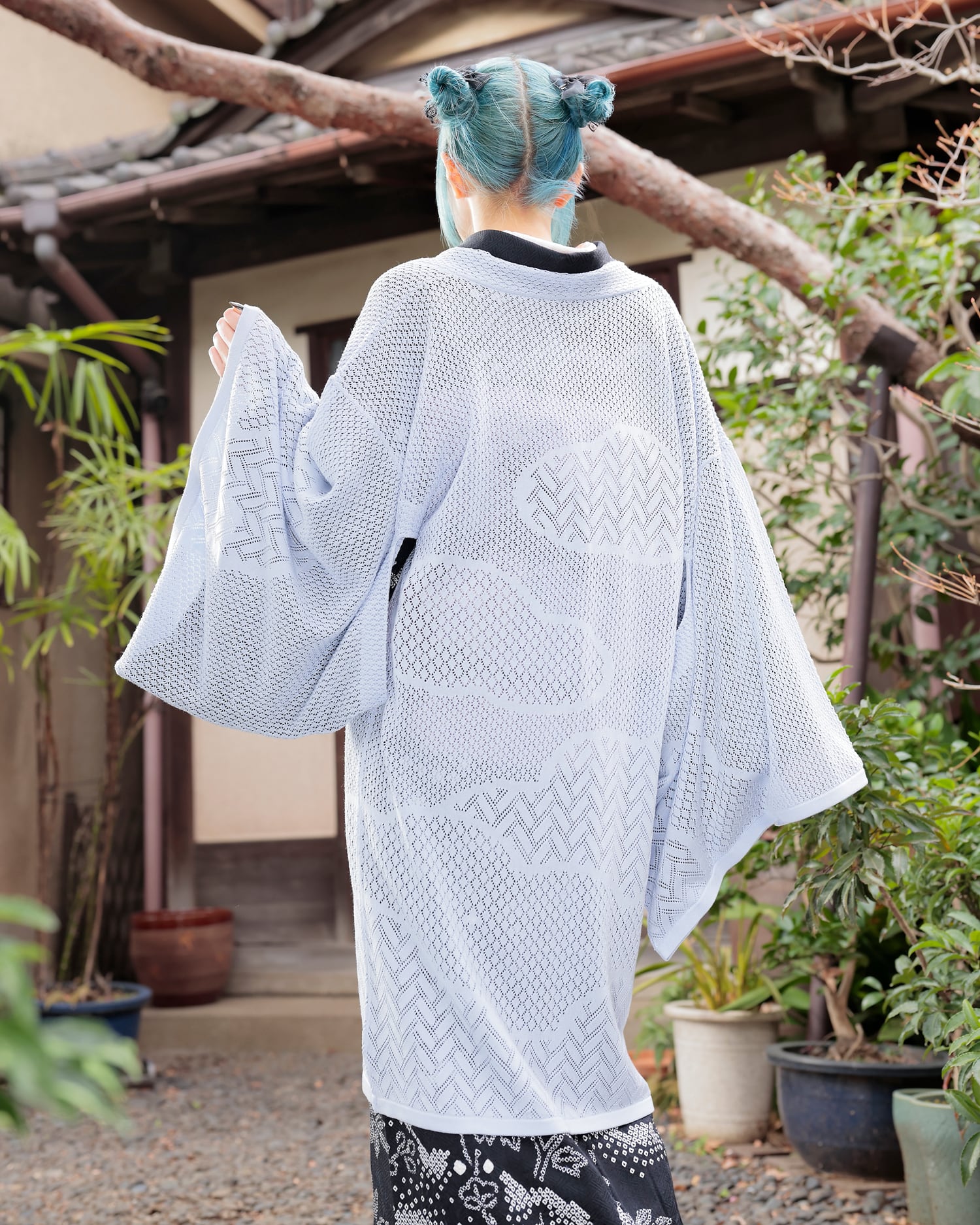 空に浮かぶ雲と、日本の伝統文様である雲取柄から着想を得た羽織です。